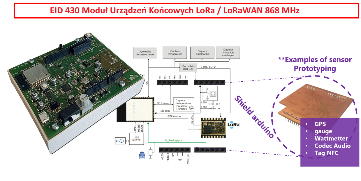 - EID430: moduł urządzenia końcowego LoRa / LoRaWAN, 868 MHz, w komplecie: mikrokontroler ESP32 SoC (dwurdzeniowy, 32-bitowy mikroprocesor XTENSA LX6 o częstotliwości 240 MHz, 600 DMIPS, Bluetooth, WiFi) z pamięcią Flash 32 Mbit, moduł interfejsu UART, dwa moduły interfejsu SPI, dwa moduły magistrali I2C, interfejs USB i RS232, sześć wejść ADC, dwa wyjścia DAC. Pomiary: poboru prądu, napięcia akumulatora, magistrali szeregowej I²C, SPI.