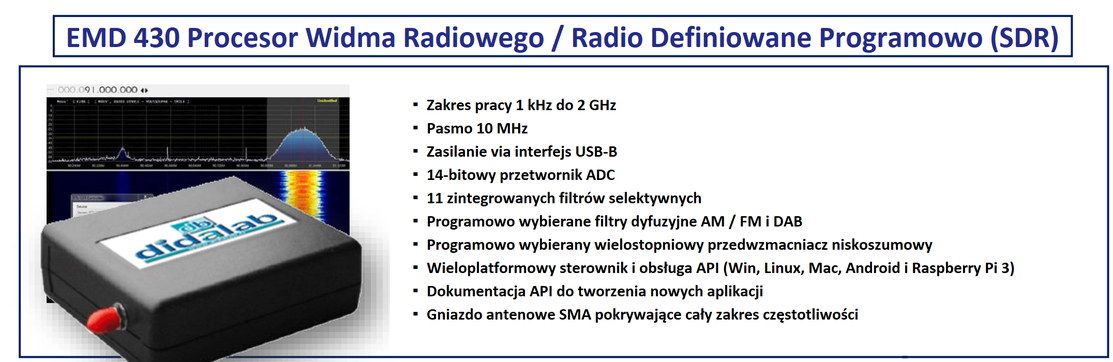 - EMD430: Procesor widma radiowego, radio definiowane programowo (SDR - Software Defined Radio), przewód USB AB.