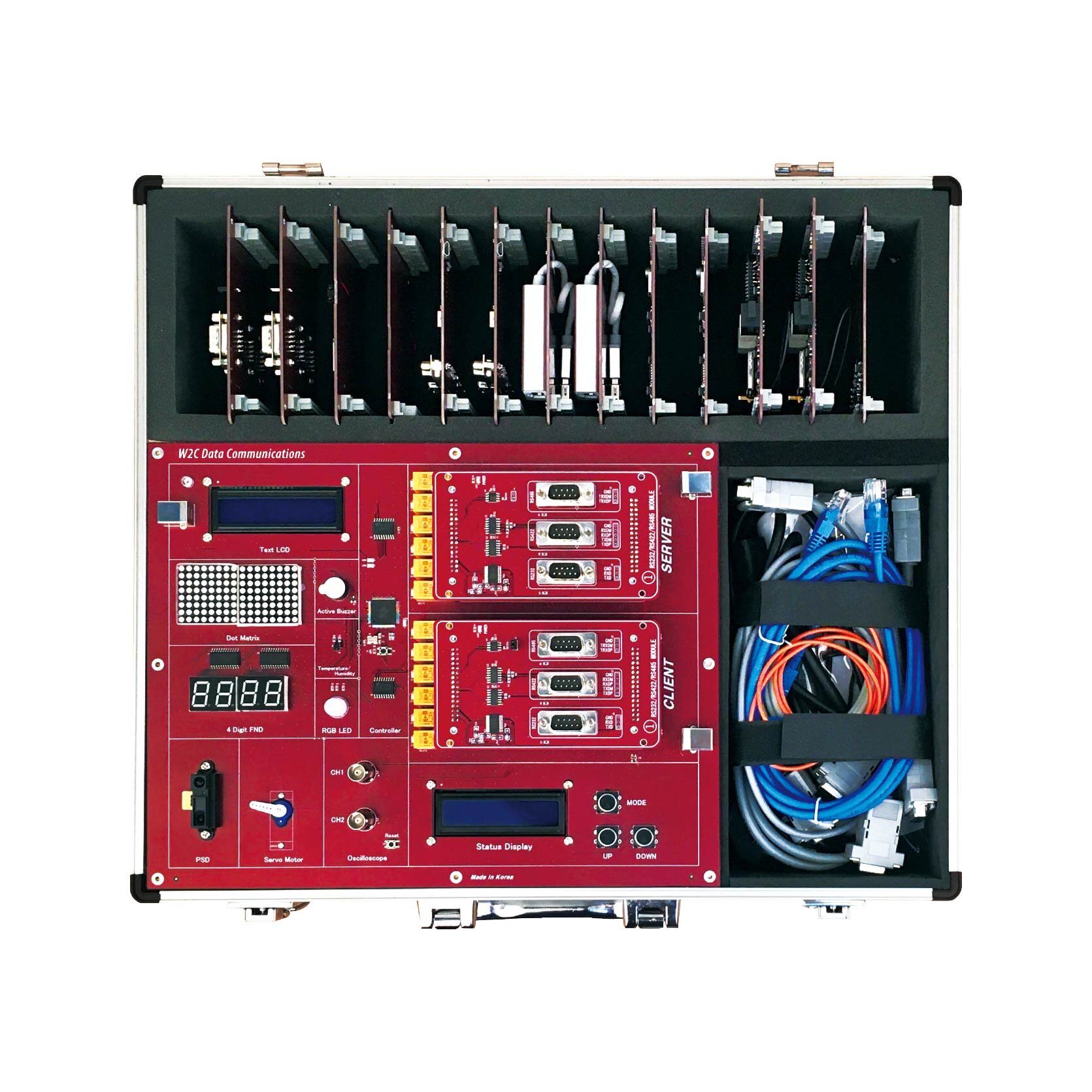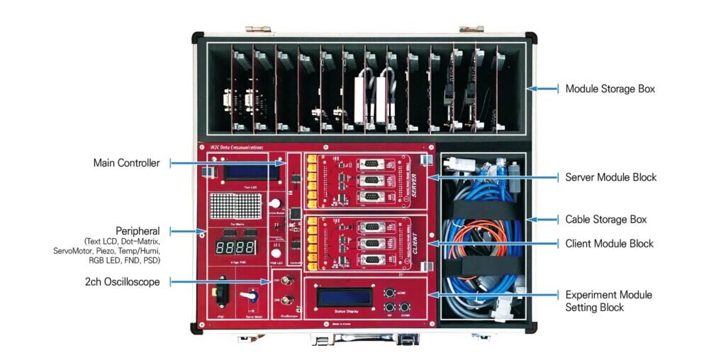 - 7 modułów edukacyjnych do łączności przewodowej i 7 modułów do łączności bezprzewodowej, nauka technologii łączności przewodowej oraz bezprzewodowej w strukturze serwer-klient.