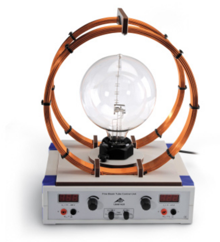 Kompletny system doświadczalny do określania ładunku właściwego elektronu i badania odchylania wiązek elektronów w jednorodnym polu magnetycznym. System jest dostarczany w komplecie z lampą elektronową o małej wiązce, parą cewek Helmholtza do generowania jednorodnego pola magnetycznego oraz jednostką sterującą układem zasilania. Lampa elektronowa o małej wiązce i para cewek Helmholtza są zamontowane na jednostce sterującej, a sama lampa elektronowa obraca się wokół swojej osi pionowej. Lampa i para cewek są połączone wewnętrznie z jednostką sterującą bez zewnętrznego okablowania. Wszystkie napięcia zasilania lampy i prąd przepływający przez cewki Helmholtza są regulowane. Wartości napięcia anody i prądu cewki są wyświetlane cyfrowo i mogą być dodatkowo odczytane jako wartości napięcia równoważnego. Wewnątrz lampy elektronowej o małej wiązce, ostro ograniczona wiązka elektronów jest generowana przez system składający się z pośrednio nagrzewanej katody tlenkowej, perforowanej anody i cylindra Wehnelta. Jonizacja zderzeniowa atomów neonu tworzy bardzo jasny, a jednocześnie ostro ograniczony ślad ścieżki elektronów w lampie. Jeśli rura jest optymalnie ustawiona i przez cewki Helmholtza przepływa odpowiedni prąd, elektrony są odchylane na orbitę kołową, której średnicę można łatwo określić, gdy elektrony uderzają w jeden z równoodległych punktów pomiarowych, powodując zaświecenie się jej końca. Średnica, napięcie anodowe i pole magnetyczne to parametry służące do określenia ładunku właściwego elektronu. Znając geometrię pary cewek Helmholtza można obliczyć wartość pola magnetycznego na podstawie prądu cewki.