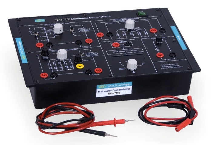 Zestaw edukacyjny - Nvis 7106 Demonstrator Multimetru to wszechstronny produkt szkoleniowy stosowany w laboratoriach elektronicznych. Użytkownicy zestawu mogą w łatwy sposób zrozumieć połączenia potrzebne do pomiarów różnych urządzeń elektrycznych oraz wielkości takich jak napięcie, prąd i rezystancja. Nvis 7106 wyposażono w trzy sekcje pomiarowe - pomiar napięcia (zarówno AC, jak i DC), pomiar prądu oraz pomiar rezystancji. Układ kondycjonowania sygnału, sekcje konwersji AC na DC, wyświetlacz LED i tester ciągłości są również dostępne na panelu czołowym. Przy pomocy obrotowych potencjometrów użytkownik może wybrać funkcję, zakres lub miejsce po przecinku.