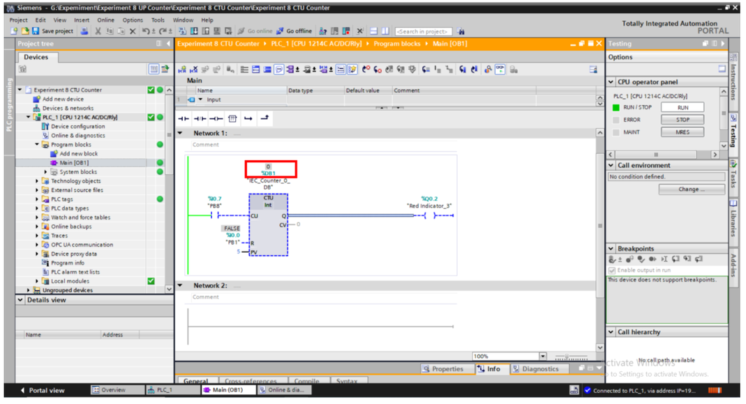 - PLC i jego port programowania: Siemens PLC CPU1214C wyposażony jest w wydajny procesor ze zintegrowanymi wejściami / wyjściami cyfrowymi i analogowymi. Posiada 16 wejść cyfrowych, 16 wyjść cyfrowych, 6 wejść analogowych, 2 wyjścia analogowe z komunikacją Ethernet.