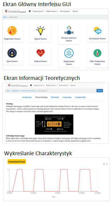- Scientech SensorLab ST2311 wyposażono m.in. w: układ kondycjonowania sygnałów, rejestrator do akwizycji danych pomiarowych (DAQ) - rejestrowanie danych w formacie .csv, moduł pamięci do przechwytywania i przechowywania wykresów, narzędzia Office do przeglądania plików PDF i doc, port USB do podłączenia klawiatury oraz pendrive'a, port Ethernet oraz port HDMI