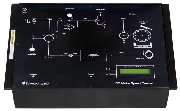 Zestaw edukacyjny Scientech 2457 - sterowanie prędkością silnika prądu stałego został oparty na kompaktowym silniku prądu stałego z magnesami trwałymi. Zestaw umożliwia łatwą konfigurację do sterowania prędkością silnika DC za pomocą techniki modulacji szerokości impulsu (PWM). Obciążenie silnika może być różnicowane za pomocą wbudowanego hamulca elektrowirowego / wiroprądowego. Użytkownik ma możliwość  bezpośredniego pomiaru głównych cech układu regulacji prędkości, a mianowicie: uchyb ustalony, sterowanie z odrzucaniem zakłóceń od obciążenia, wzmocnienie sterowania wstępnego, ...