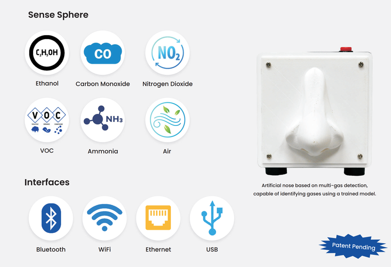 - Sztuczny nos wyposażony w wielokanałowy czujnik gazu (detekcja etanolu C2H5OH, tlenku węgla, dwutlenku azotu NO2, lotnych związków organicznych VOC, amoniaku NH3 oraz jakości powietrza).